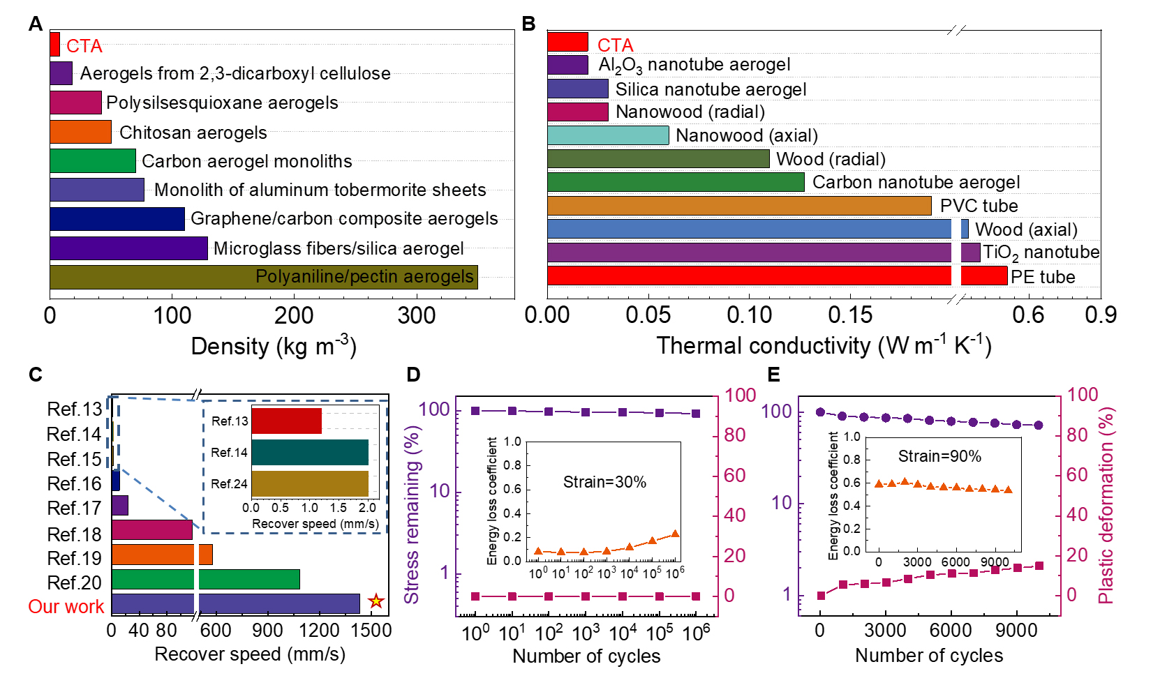 图2. CTA的性能表征。(A)不同材料密度的对比;(B)不同材料热导率的对比;(C)不同材料回复速度的对比;(D)CTA在压缩形变为30%的条件下,压缩一百万次的机械性能变化;(D)CTA在压缩形变为90%的条件下,压缩一万次的机械性能变化。